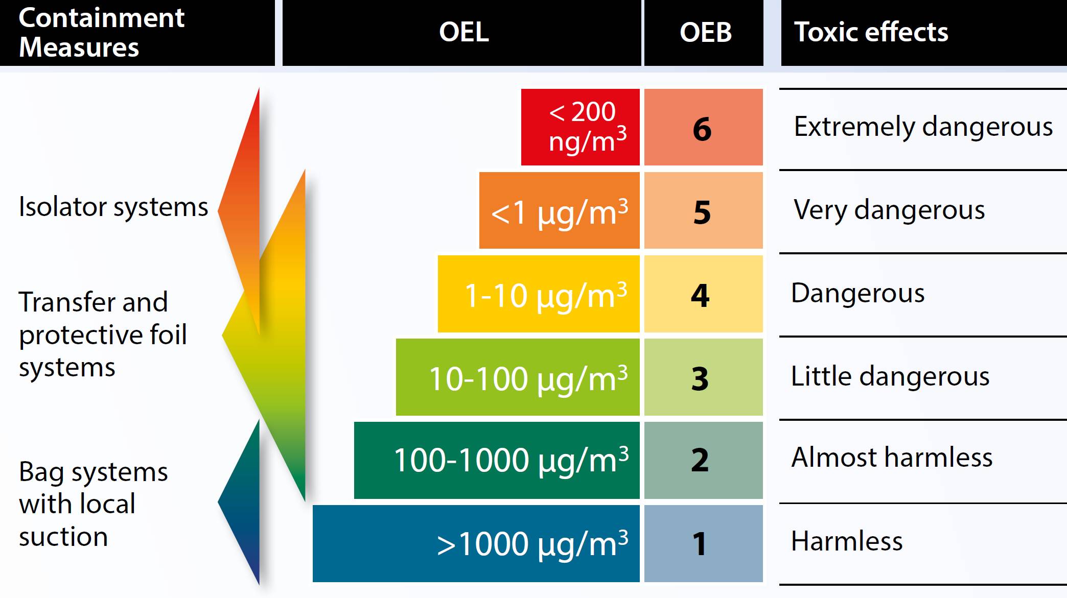 Lugaia bietet seinen Kunden unterschiedliche Sicherheitskonzepte in Übereinstimmung mit den erforderlichen OEL-Werten (OEL = Occupational Exposure Limit, OEB = Occupational Exposure Band).