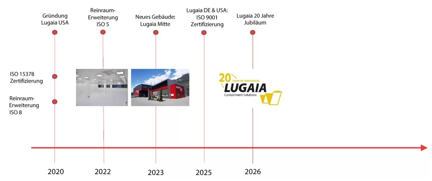 Erfahren Sie, wie Lugaia zu einem führenden Anbieter von folienbasierten Single-Use-Containment-Systemen wurde. Seit der Gründung 2006 steht unser Unternehmen für Schweizer Präzision und innovative Lösungen in der Hygieneprozesstechnik.