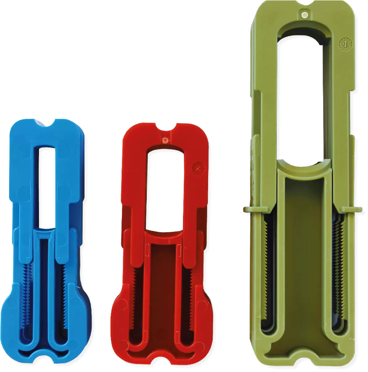 The Lugaia SafeSeal Crimp in 3 different sizes: S (blue), M (red), L (green)